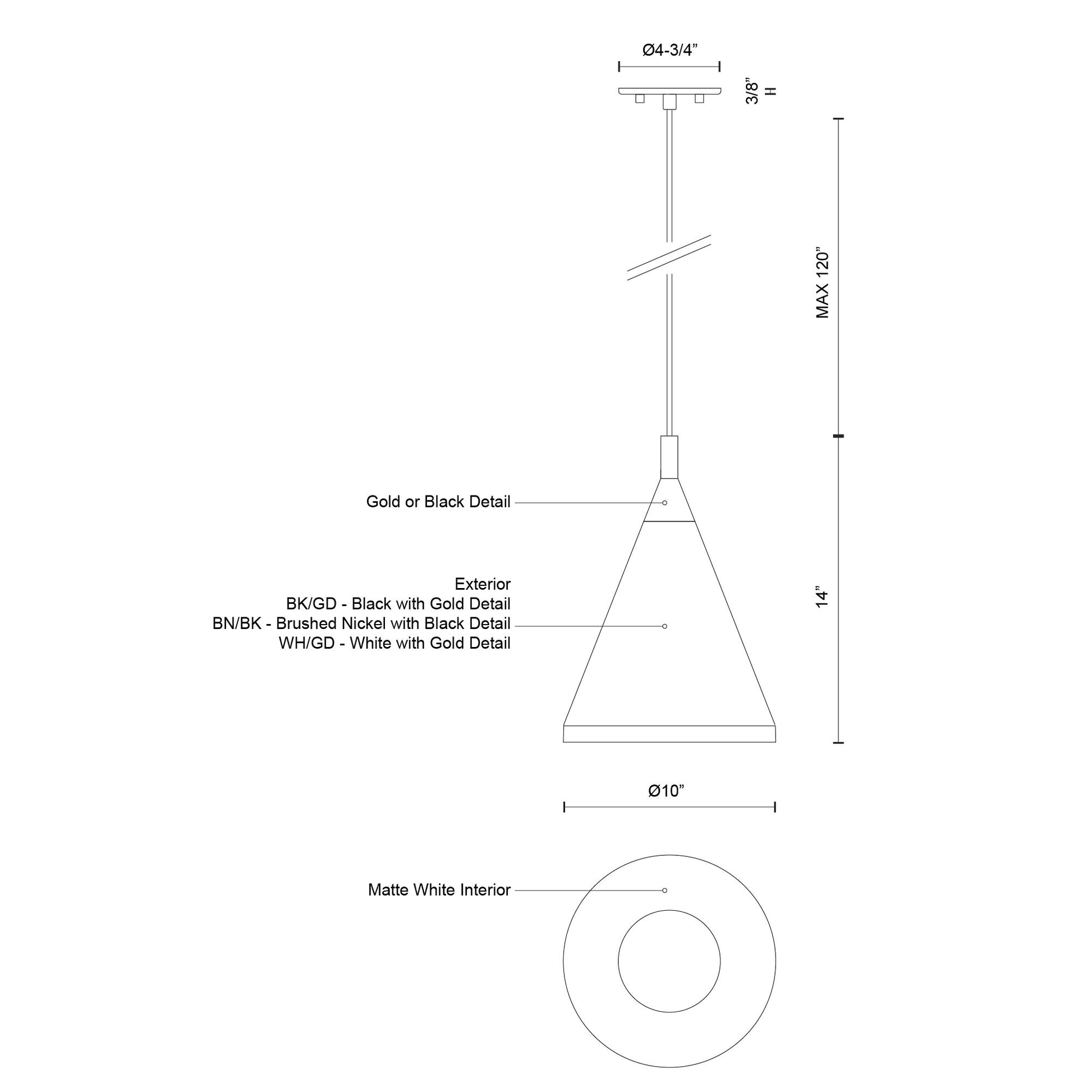 Single lamp pendant with conical aluminum shade with fine powder-coated or plated finishes with contrasting finial. Exterior shade colors are black or white with gold detail or brushed nickel with black detail. Suspended by cloth cable. Available in 3 sizes.