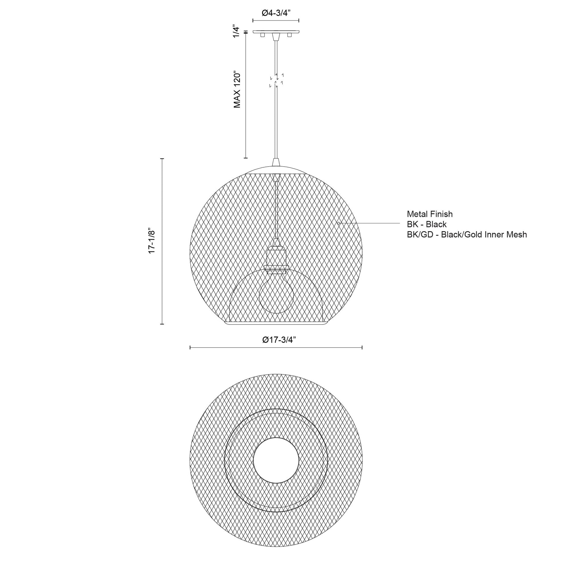 Single lamp pendant with spherical powder-coated wire mesh shade. Color configurations include uniform black or an exterior black with inner gold mesh. Suspended by matching cable. Available in 2 sizes.