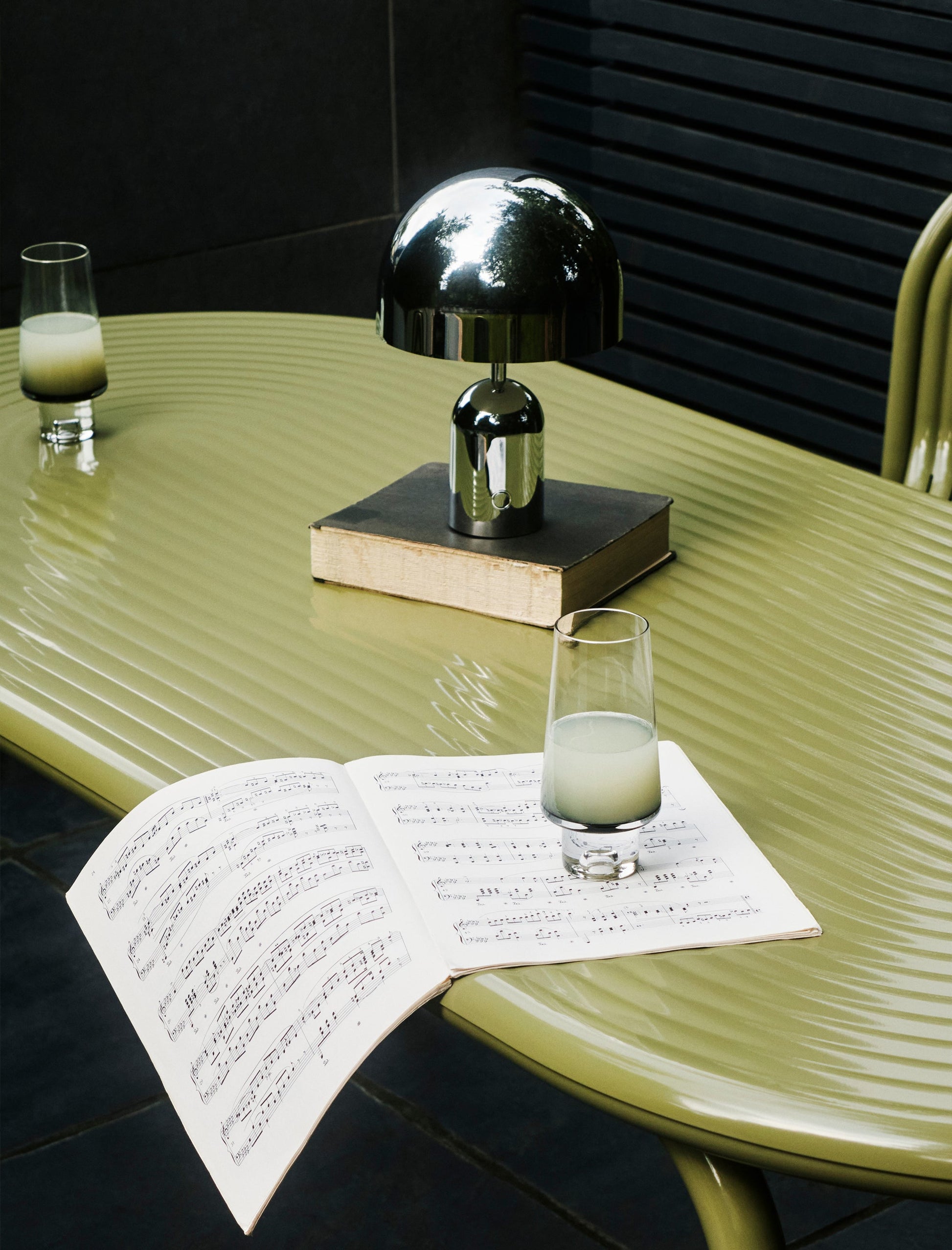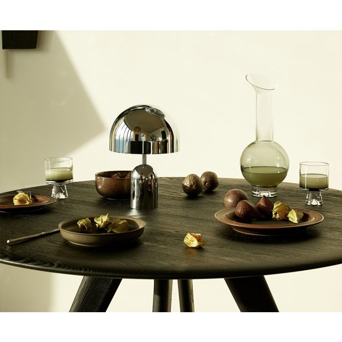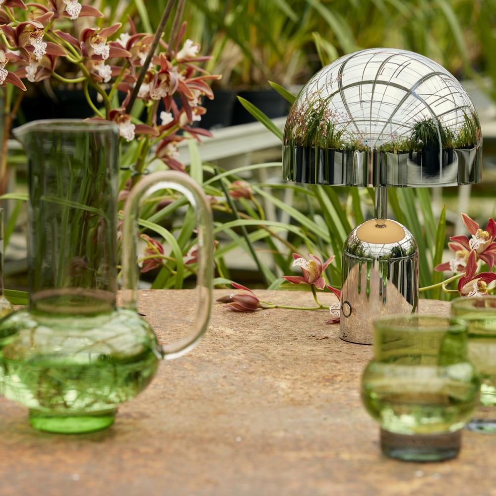 Tom Dixon x FixtureFarm - A portable light with hyper-polished shade and concealed light source diffuser. Rechargeable with 9 hours battery life. The Tom Dixon BELL LED portable rechargeable LED table lamp mirrors its surroundings, while a concealed diffuser produces its soft lighting. An exercise in reductionism, BELL is a dome suspended over a dome formed of plated pressed steel. A stunning, highly engineering portable light that acts as a real exclamation mark in any interior. Tom Dixon x FixtureFarm BEPO01SSUN