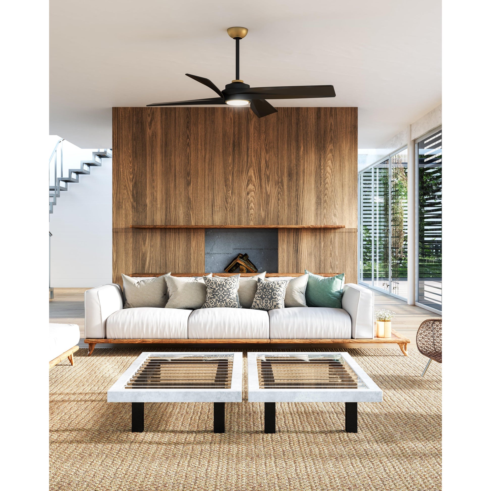 The Horizon fan collection is a simple, modern design with elegant decorative touches.Available in three stunning finishes, including a trendy Black and Brushed Gold mixed-metal option, the Horizon Collection is truly stunning. Fan is remote controlled and features six speeds and dimmable LED illumination.