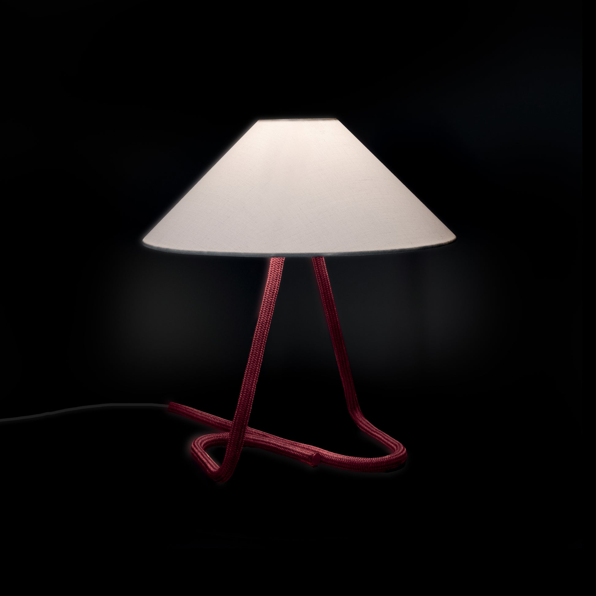From the Hat collection. Dimensions: H 20", W 17.3", D 17.3". Lamping: 1 x 11W E26 Full light LED light bulb × Full light LED light bulb. Mounting: LED. HAT TA - FRAME COVERED WITH RED ROPE, WHITE LINEN SHADE "USA".