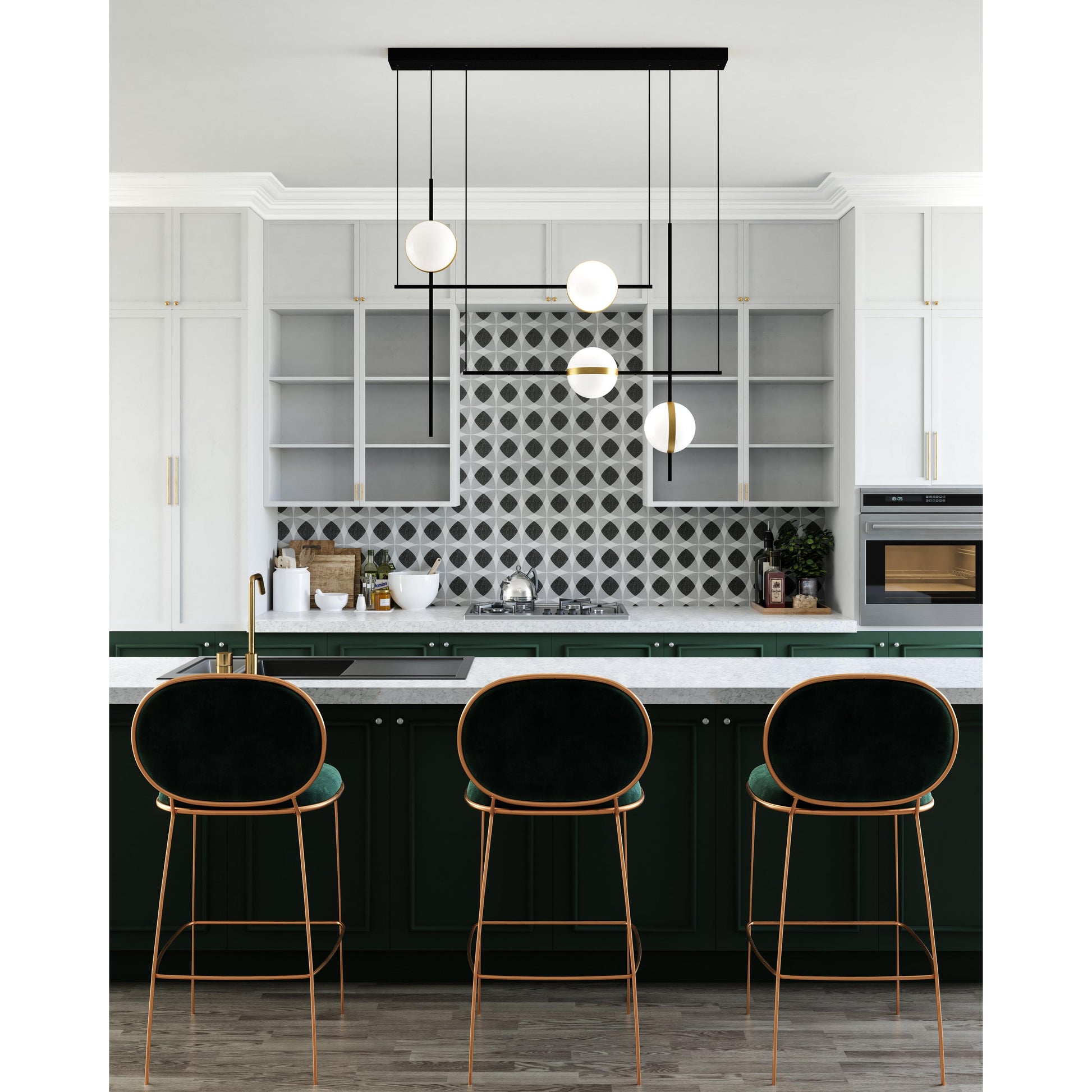 A mixture of finishes and design, Tagliato is a blended style of fixtures. Matte Black frames are accented with distinct details of Brushed Gold including a band around the opal globes and fixture joints. The look of the rotating globes and contrasting finishes is the perfect combination of modern and classic design.