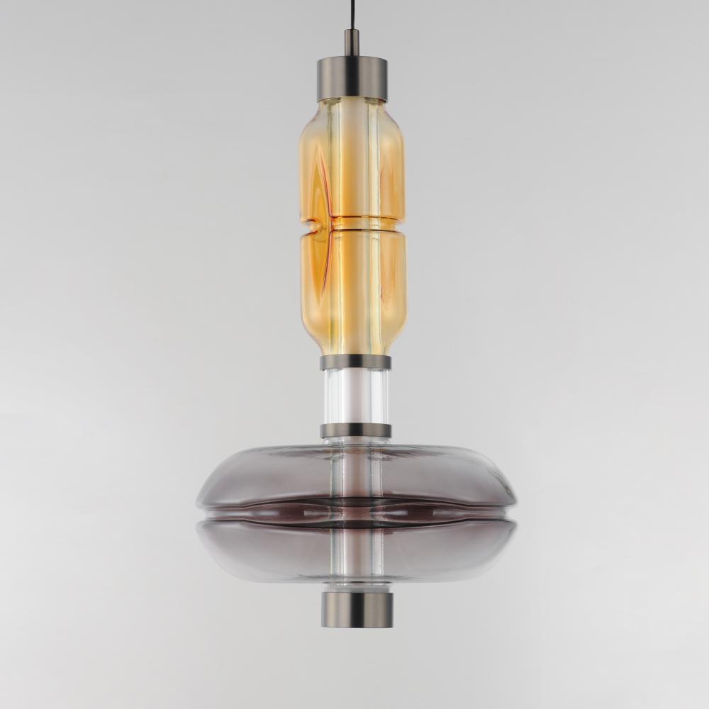 Studio M GUSTO SM18592GM Pendant - Gunmetal. Futuristic And Full Of Gusto The Capsule Collection Designed By Cesar Giraldo Features Artisanal Hand Blown Glass Elements Colored In Cloud Like White Infused Glass Or Gradients Of Smoked Grey And Warm Amber Tones The Glasses 39 Hand Crafted Dimples Refract Dedicated Led Lighting That Highlights An Undulating Silhouette Throughout The Fixture Diffused Evenly Across A Thin Tube Of White Acrylic Encased Within A Larger Vacuum Of Clear Glass The Airy Compositions Appear To Be Floating While Amply Filling Spaces Configurations Include Both Horizontal And Linear Pendants Ceiling Mounts Wall Sconces And Portable Lamps Sized For Multiple Applications Available In Metal Accents Finished In Gunmetal Or Gold Studio M MPN: SM18592GM